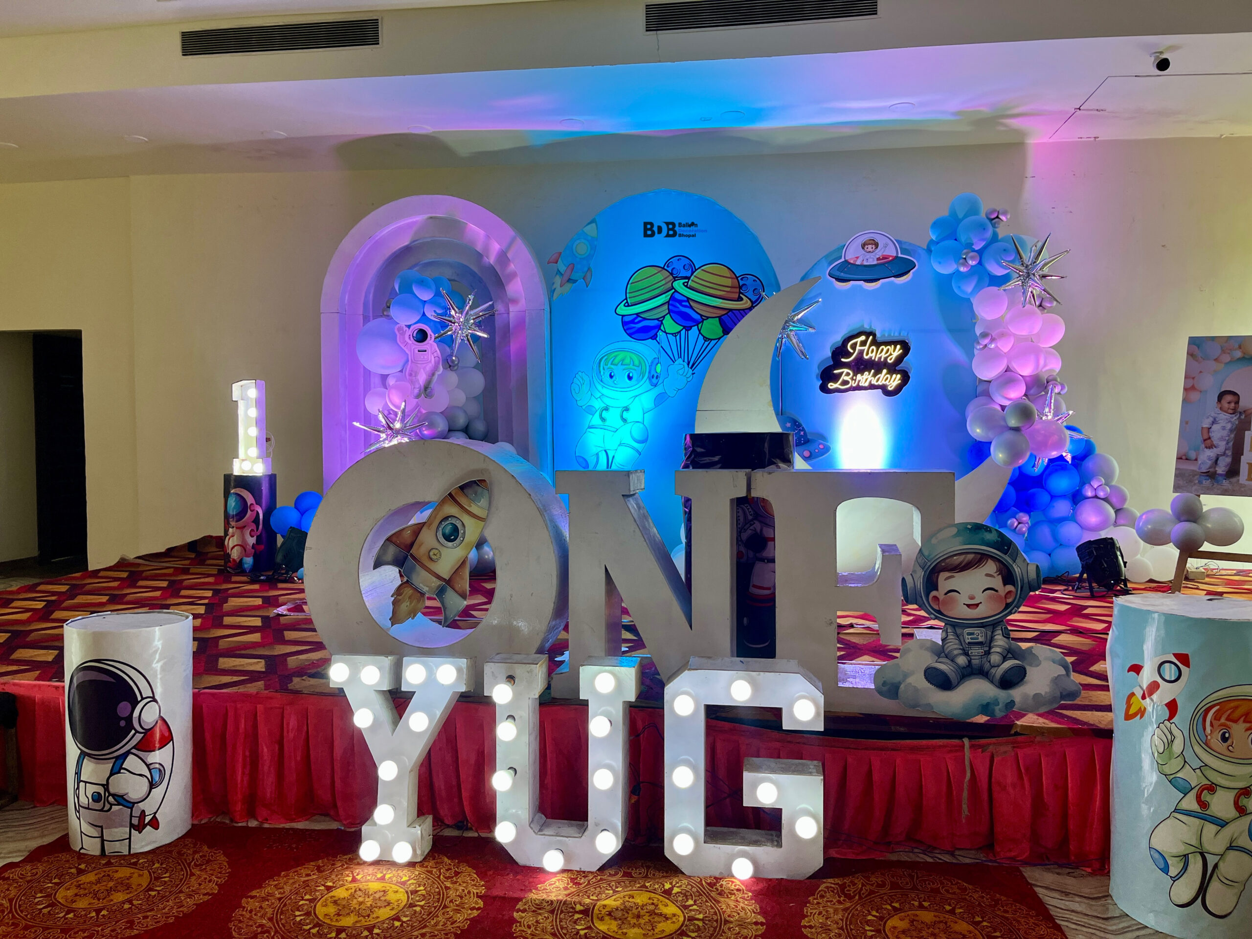 - Stellar Stage: A magnificent backdrop with a moon/planet motif, custom large light-up “ONE YUG” letters, and playful astronaut props, creating an incredible photo opportunity.