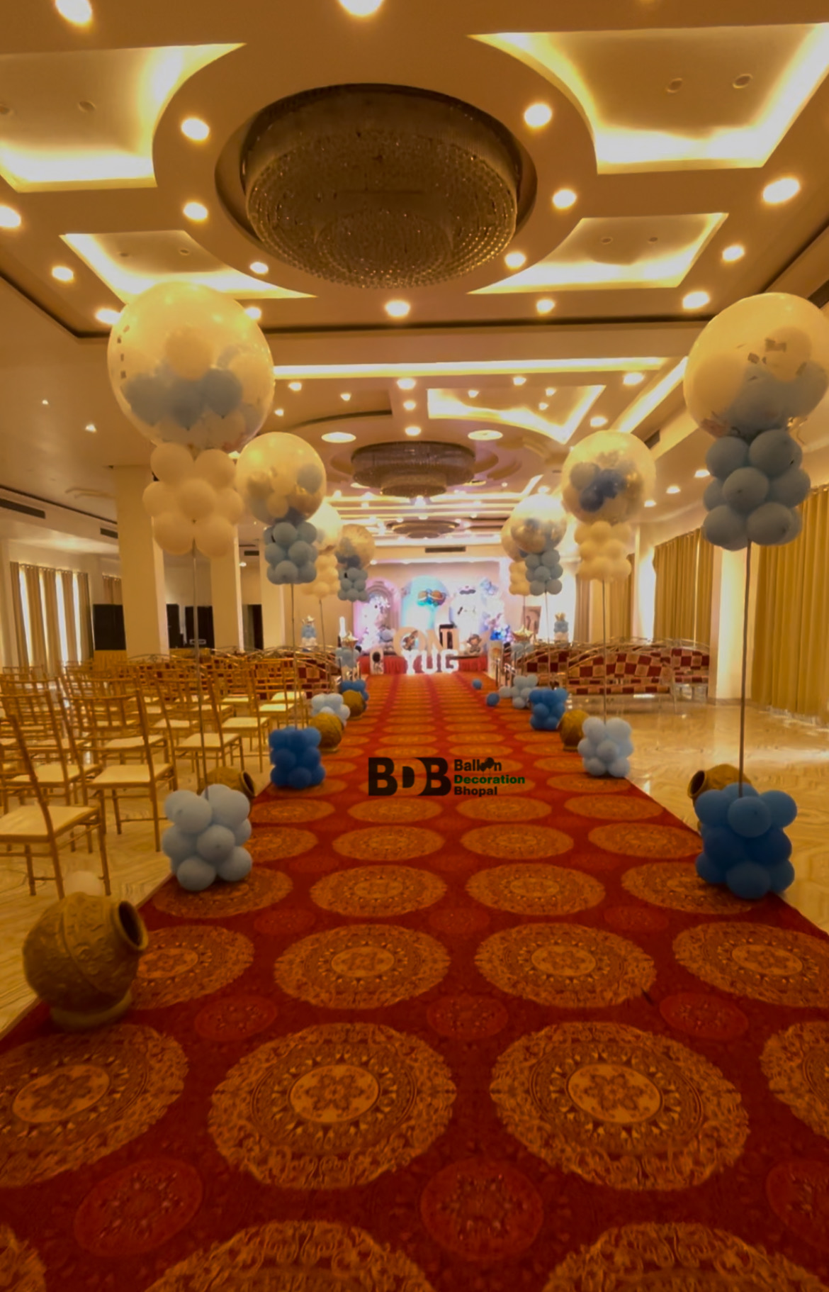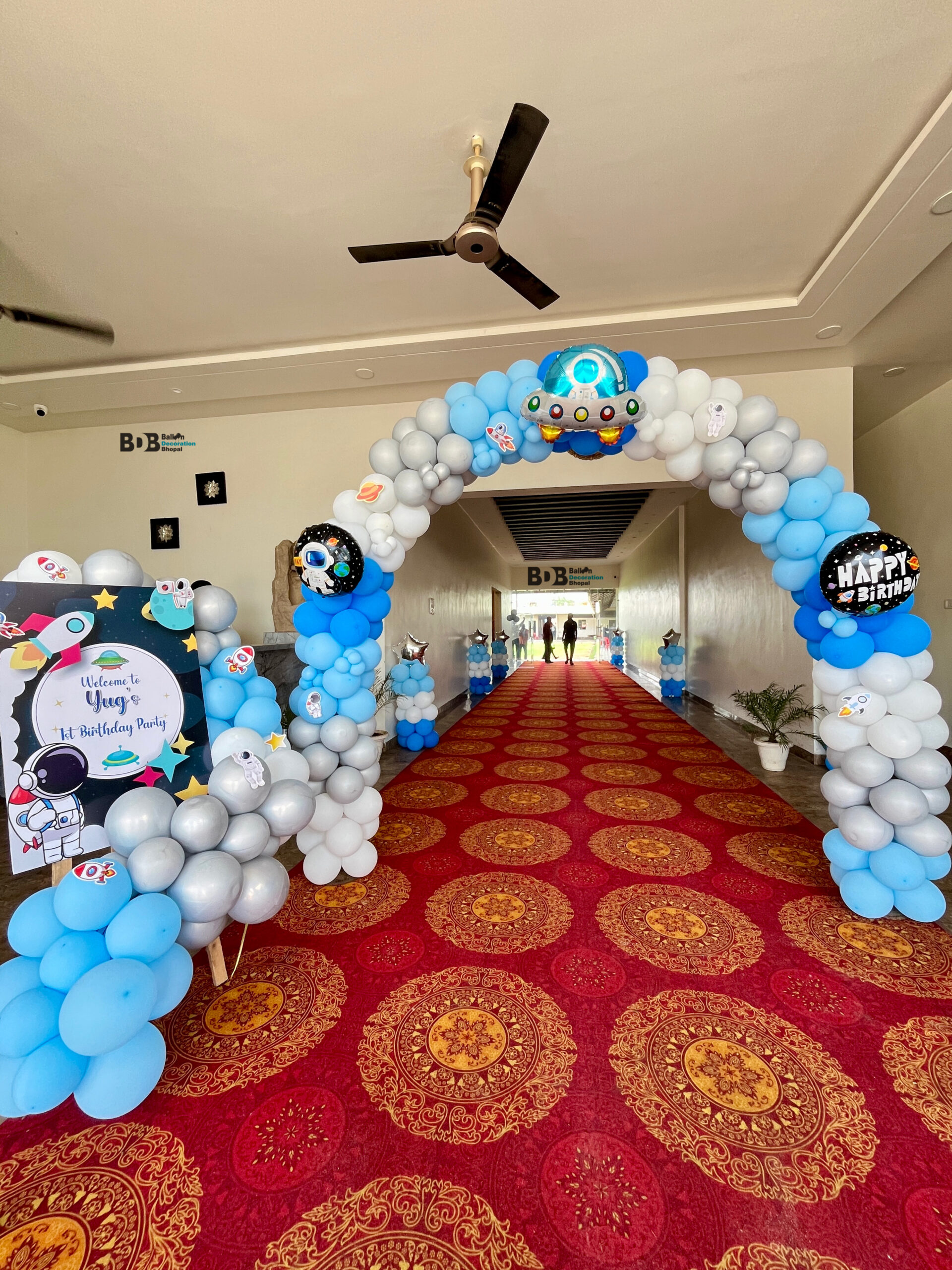 A comprehensive and spectacular space-themed balloon decoration package perfect for a baby’s 1st birthday, celebrating “Yug.” This setup transforms your venue with a celestial ambiance using a cool palette of blue, white, and silver balloons.