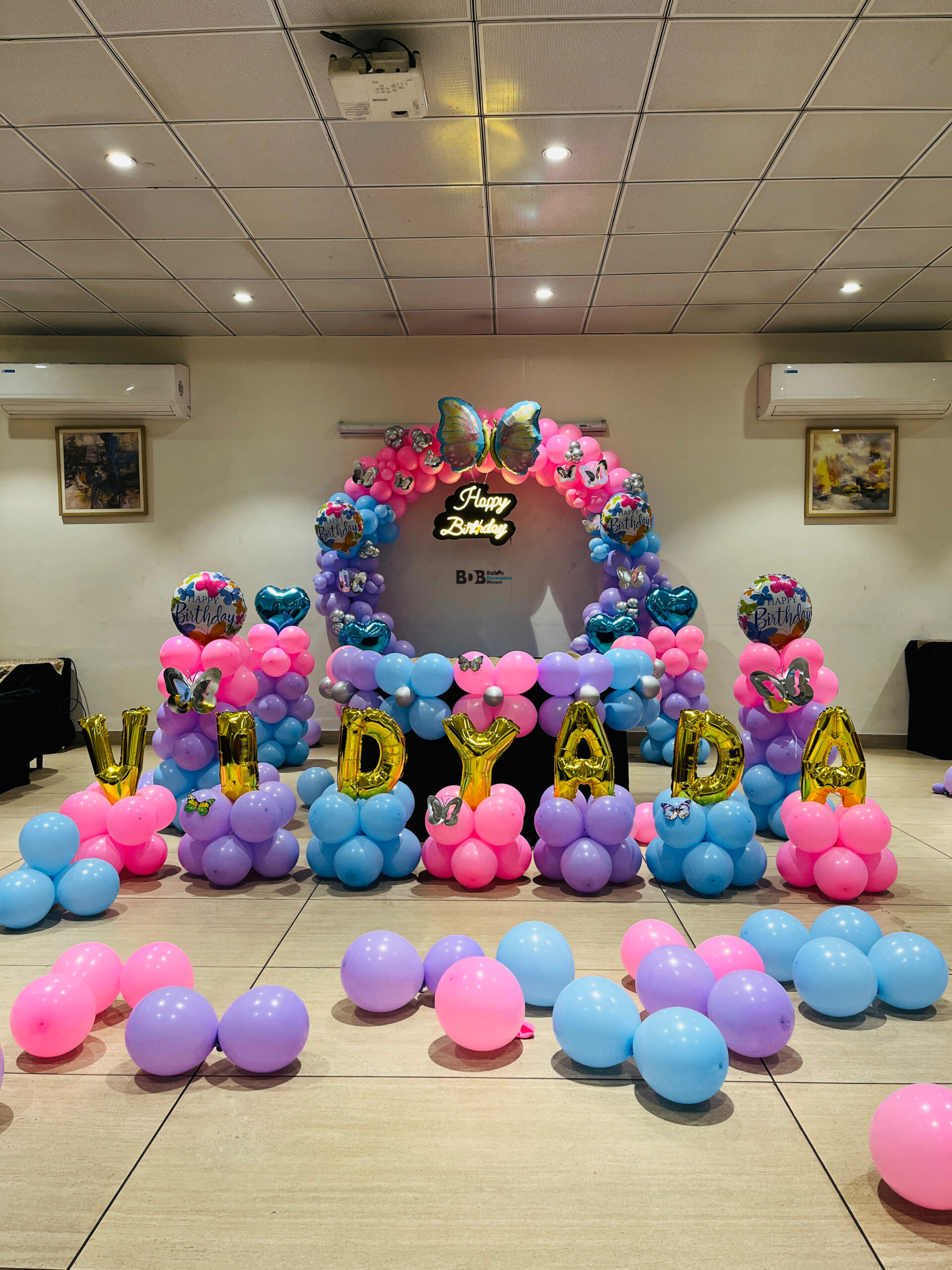 Special Elements: Hum use karte hain 3D butterfly cutouts, metallic star balloons, aur glossy floor clusters jo poore area ko fill kar dete hain.