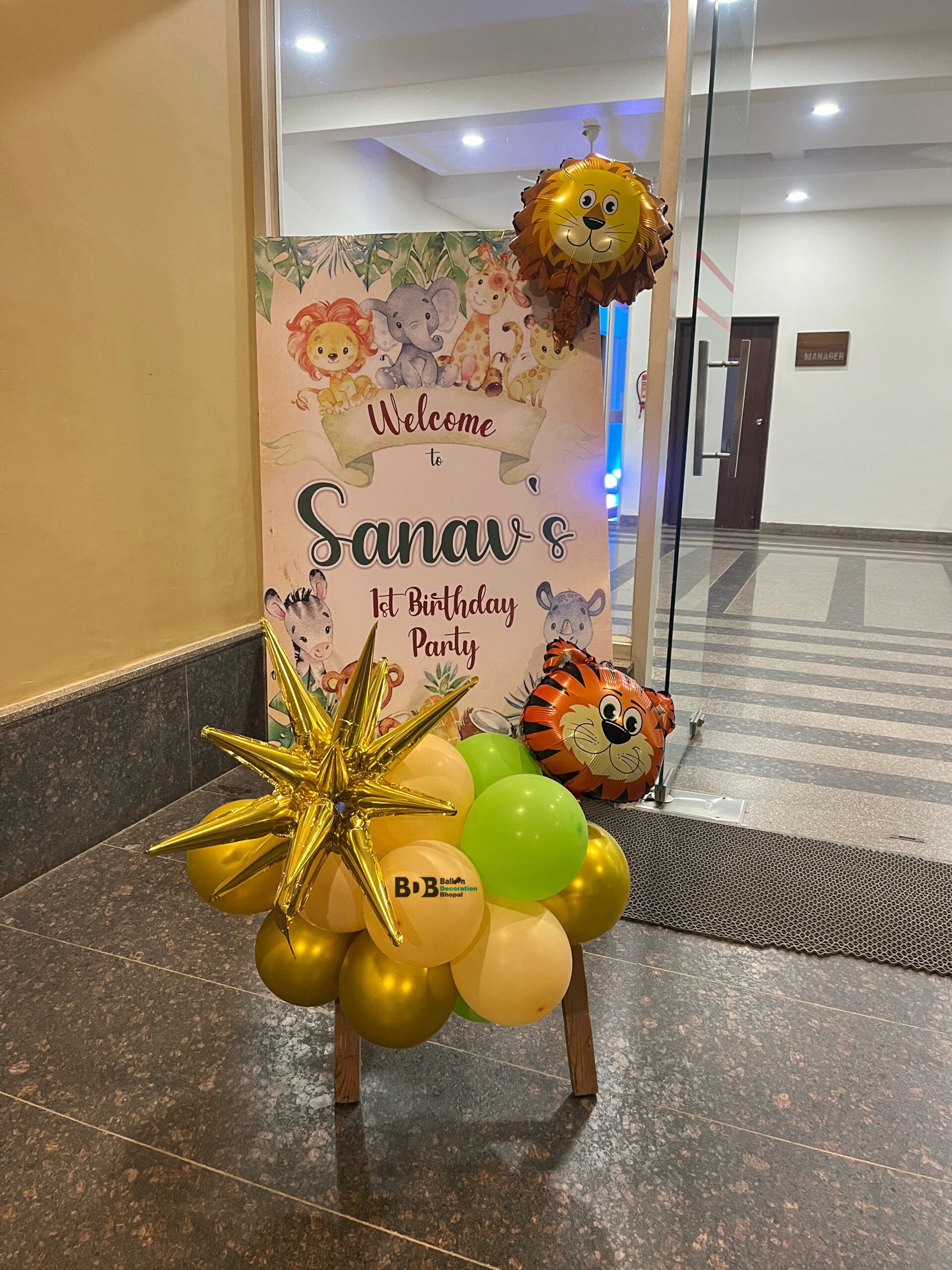 We offer professional Jungle Theme Balloon Decoration in Bhopal specially designed for kids birthday parties and first birthday celebrations. This complete jungle safari theme setup creates a fun, colorful and premium party experience from the entrance to the stage.