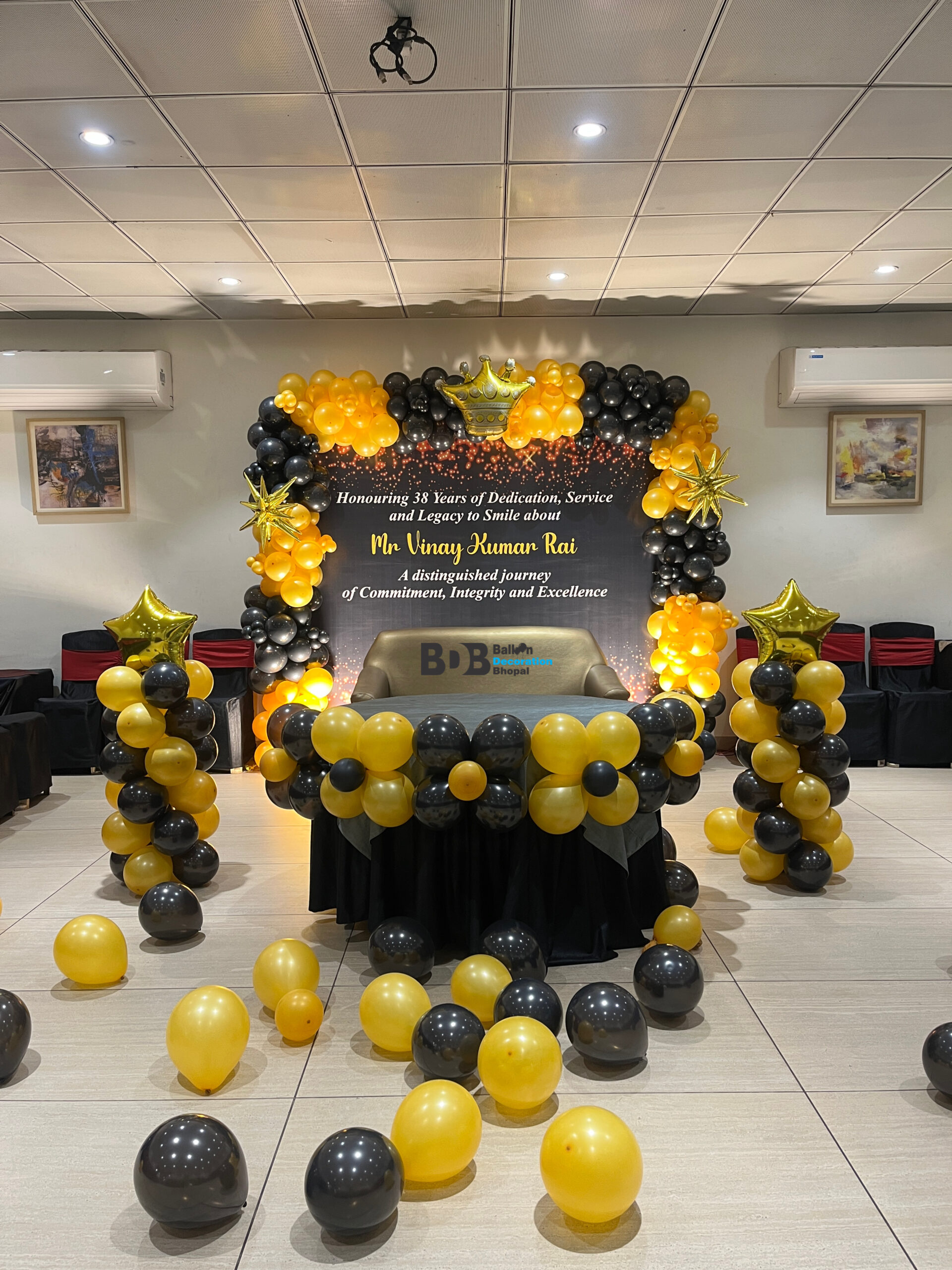 This premium setup is designed specially for corporate honour ceremonies, retirement functions, award nights and service celebrations. The decor features an elegant black and gold balloon arch, royal crown theme backdrop, LED sparkle background, star foil balloons and a professionally styled stage table.