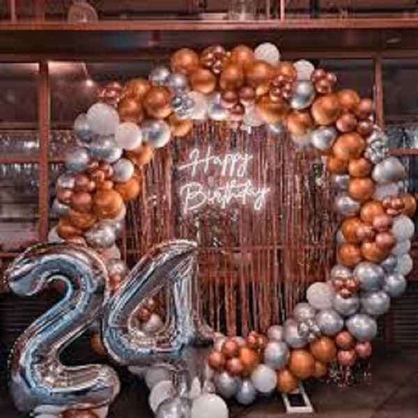 Elevate your celebration with this Luxury Rose Gold & Silver Balloon Backdrop, a refined and visually striking décor installation designed for milestone birthdays and upscale events. This premium setup is centered around a modern circular metal frame, artfully styled with a lush balloon arrangement that blends rose gold, chrome silver, pearl white, and metallic accents for a timeless yet contemporary finish.