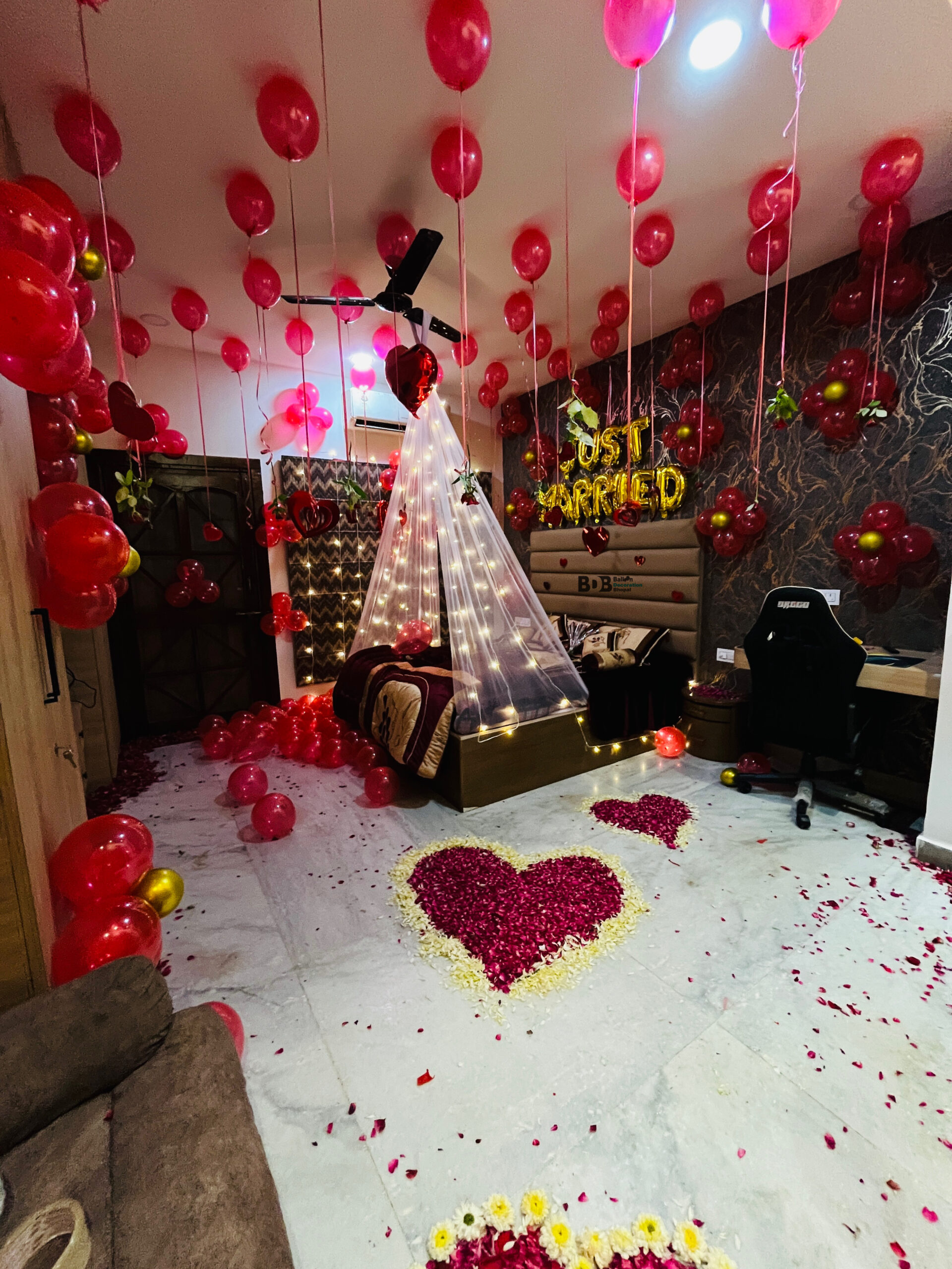 Surprise your partner with romantic room decoration in Bhopal featuring red balloons, rose petals, fairy lights and Just Married setup by Balloon Decoration Bhopal.