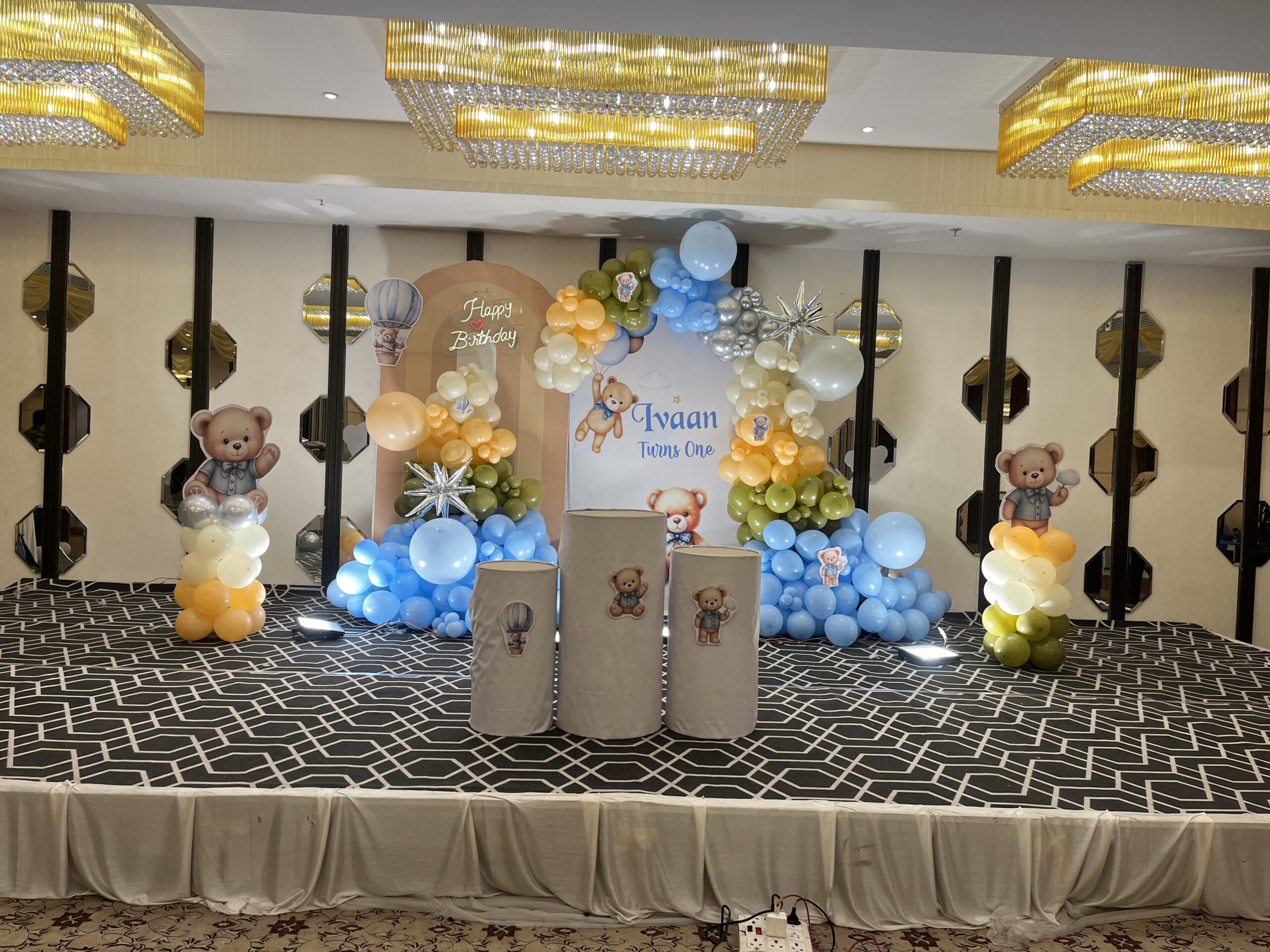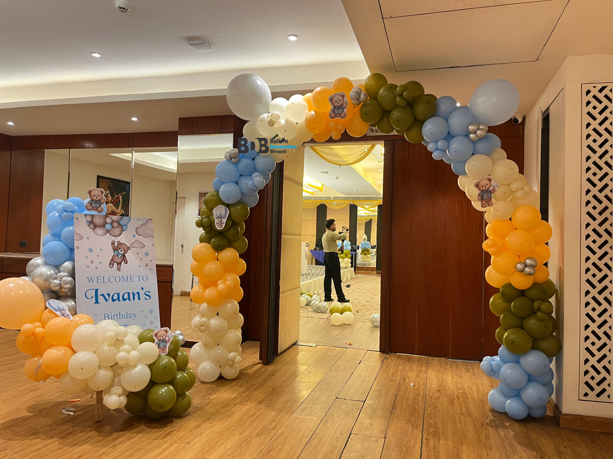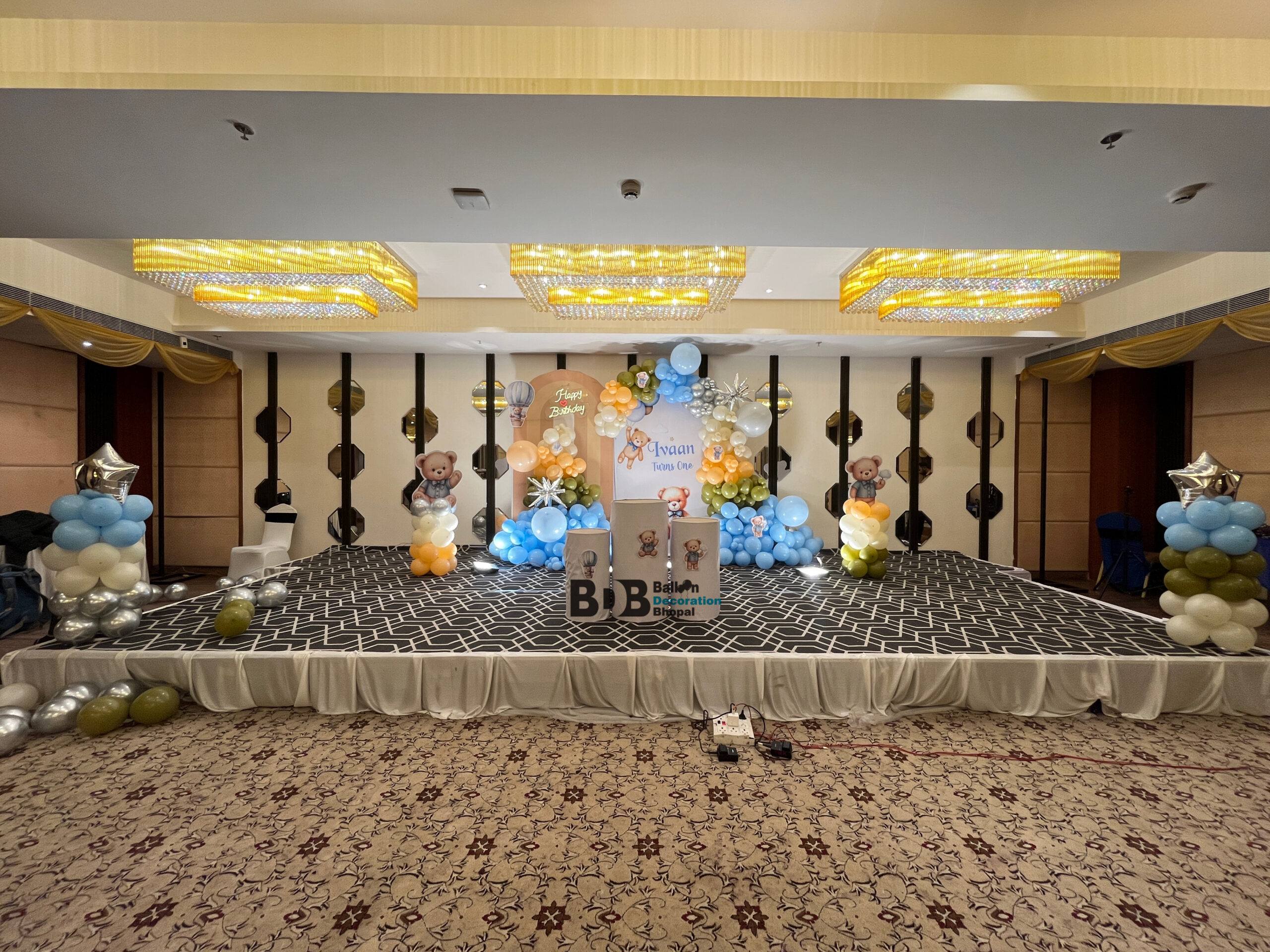 Make your child’s first birthday truly memorable with our Teddy Theme First Birthday Balloon Decoration, exclusively designed by Balloon Decoration Bhopal. This premium decoration setup is ideal for baby boy birthday celebrations, especially first birthdays hosted at banquet halls and large indoor venues.
