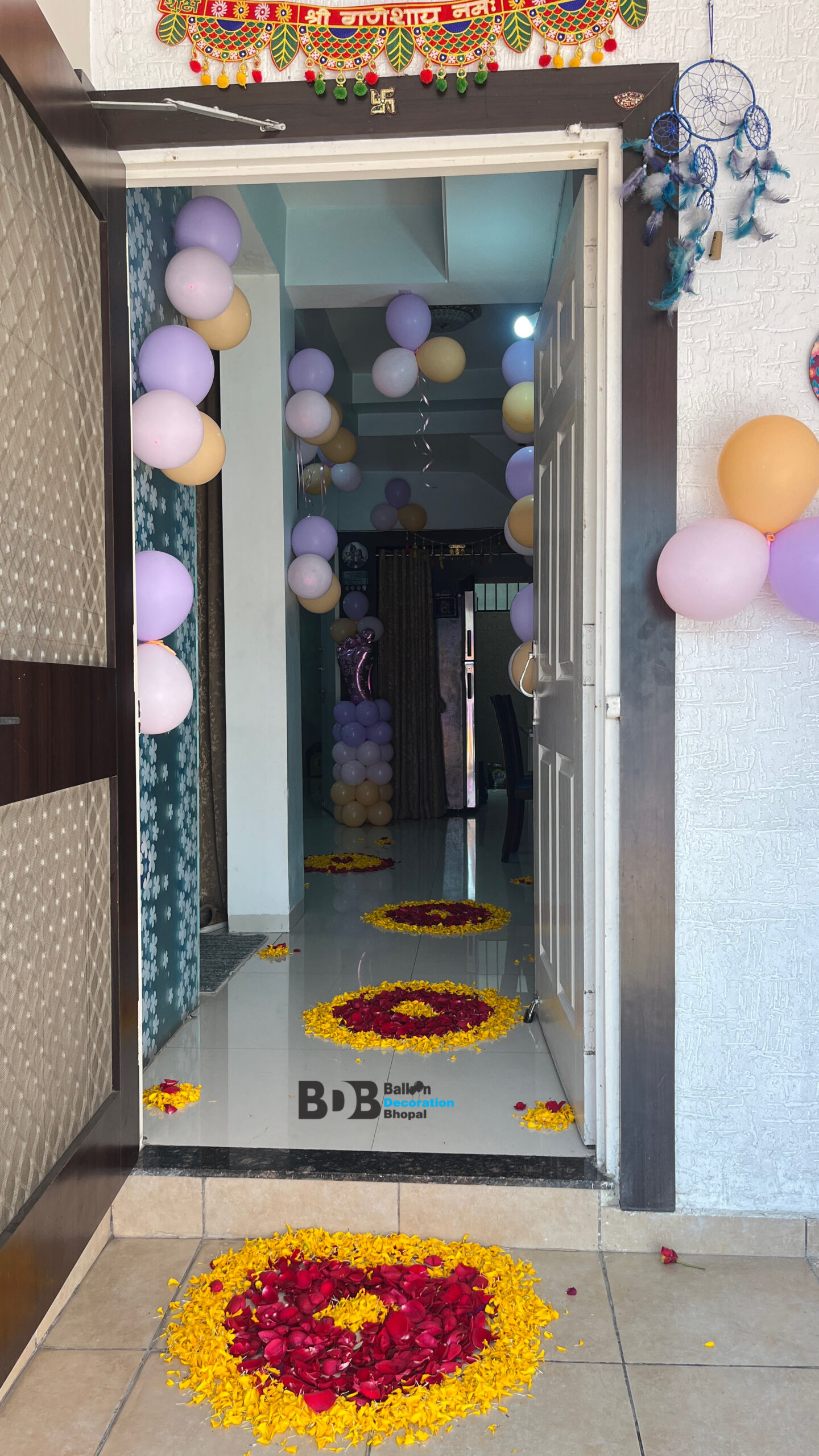 Grand Entrance Arch: Ghar ke bahar ya darwaze par ek bada pastel-colored balloon arch, jisme “Baby Girl/Boy” ke foil balloons aur cute baby-themed cutouts hote hain.